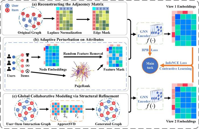 針對上述問題,劉玉升所在團隊提出了一種基于鄰接矩陣重構與屬性自適應擾動的圖增強方法,能夠在保持原始語義信息的同時,自適應地去除圖中的噪聲干擾,從而提升推薦系統(tǒng)的性能與泛化能力。項目組通過長達16個月的持續(xù)攻關(包括10個月的反復實驗驗證與6個月的論文撰寫與修改),研究成果《Graph Augmentation Empowered Contrastive Learning for Recommendation》發(fā)表于CCF-A類國際權威期刊《ACM Transactions on Information Systems》。