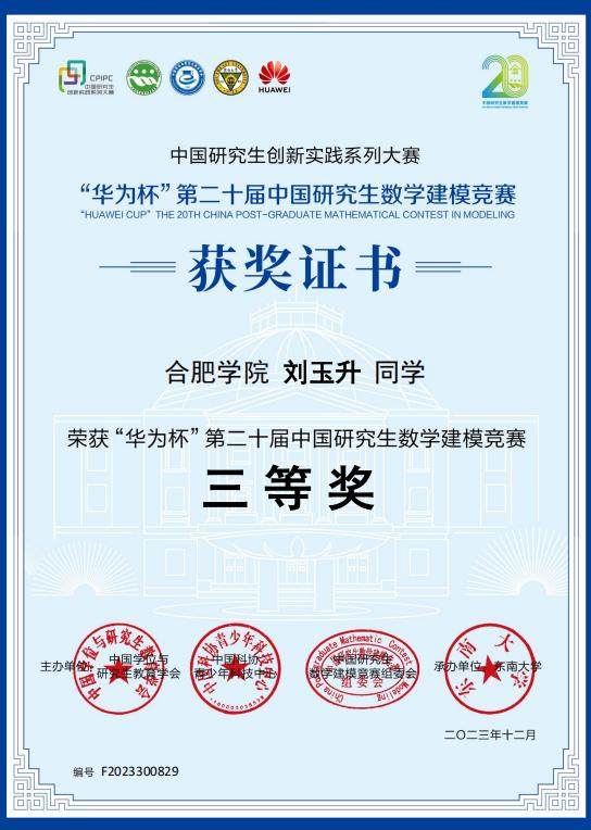 劉玉升始終秉持“以賽促學、以賽促研”的理念,積極參與各類高水平學科競賽,在實踐中不斷拓展學術視野、提升創(chuàng)新能力。在2023年“華為杯”第二十屆中國研究生數(shù)學建模競賽中,他帶領團隊克服重重困難,最終榮獲國家三等獎。