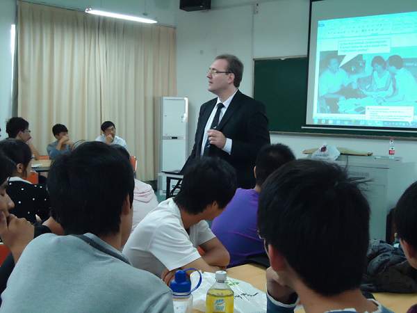 在管理系格里查先生以“跨文化交際”和“Test-DaF(德福)考試”為題為中德合作物流管理(LOGinCHINA)專業11級和12級的學生分別舉行了專題報告。在談到跨文化交際時,格里查先生介紹了中德文化差異,特別是中德兩國教師授課方式的不同,鼓勵同學們不僅要學好語言,更要從跨文化的角度盡快適應德國教師的授課,積極與教師溝通交流,以促進德語語言及專業課的學習。此外,格里查先生還向同學們介紹了Test-DaF(德福)考試的題型及應試技巧,以及如何在日常學習中有針對性地進行應試準備,爭取盡快達到進入德國高校進行專業學習的語言水平。