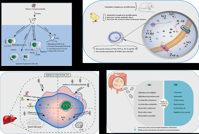 桑葉多糖的降血糖活性、免疫活性、肝細胞保護和腸道菌群影響機制圖