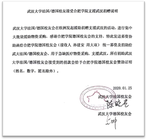 “留德校友是一家,奉獻不分你我他”。德國校友會在主席周大雙的帶領下,積極尋求到更快捷的捐獻通道——武漢大學留德校友會,連同武漢大學留法校友會并攜手眾多在歐華人組織,積極募捐。時間就是生命,合肥學院校友們在不到三天的時間里,就籌得第一批善款超過萬元。面對國內抗擊病毒醫用物資短缺的現實情況,合肥學院德國校友會利用其會員分布行業領域廣泛的優勢和資源,協助武漢大學校友會將各渠道匯總的善款在德國第一時間采購了醫用口罩、護目鏡及防護服等國內急缺醫用物資,同時協助打通了最快捷的通往武漢的物流渠道。第一批物資已經于2月2日悉數運抵武漢抗擊病毒最前線——武漢大學人民醫院和中南醫院。目前,德國校友會籌得的第二批善款也正在對接中。因為之前采購及物流通道都已打通,第二批物資也會在近日以最快的速度發往武漢。