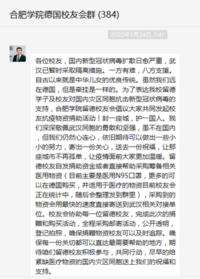 新型冠狀病毒的爆發牽動著全國人民的心弦,我校在德校友們都在時刻關注著國內疫情的變化,同時在微信群里紛紛表達了希望為國內奮戰在武漢抗擊病毒前線的醫護人員和機構貢獻一份力量的意愿。在我校駐德代表孫建安的倡導下,合肥學院德國校友會作為我校眾多留德校友的聯絡平臺,同時也是在德華人規模較大的注冊機構之一,于第一時間通過微信群、QQ群及短信等形式發布了募捐公告,為廣大校友奉獻愛心搭建了公開、公正、高效的渠道。
