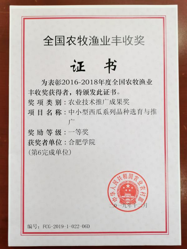 近期,農(nóng)業(yè)農(nóng)村部發(fā)布《關(guān)于2016-2018年度全國(guó)農(nóng)牧漁業(yè)豐收獎(jiǎng)獲獎(jiǎng)情況的通報(bào)》(農(nóng)科教發(fā)〔2019〕4號(hào)),表彰獎(jiǎng)勵(lì)在農(nóng)業(yè)技術(shù)推廣工作中做出貢獻(xiàn)的單位和個(gè)人。我校參與的“中小型西瓜系列品種選育與推廣”榮獲農(nóng)業(yè)技術(shù)推廣成果獎(jiǎng)一等獎(jiǎng),這是我校首次獲得全國(guó)農(nóng)牧漁業(yè)豐收獎(jiǎng)一等獎(jiǎng)。