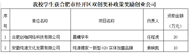 在獲此次資助之前,我校另有2家公司獲“合肥經開區雙創獎補政策獎勵”,該獎勵是針對國家、省、市各級政府部門舉辦的創新創業項目大賽中獲獎的創業項目,其中國家級獎補金額為20萬,省級獎補金額為10萬,市級獎補金額為5萬。
