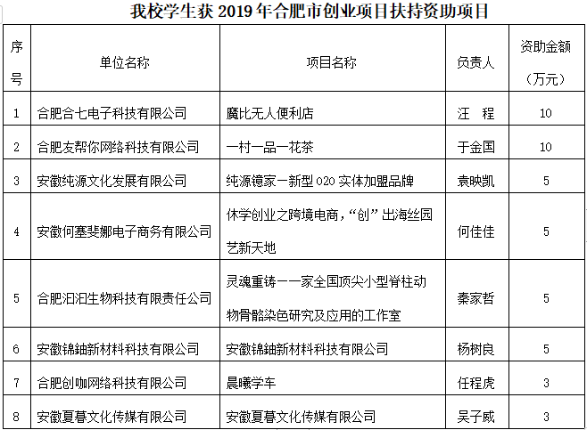 為大力推動大眾創業、萬眾創新,鼓勵高校在校生及畢業生創新創業,以創業帶動就業,2019年12月合肥市遴選資助一批高校畢業生創業項目,資助對象為全市高校在校生或畢業5年內的畢業生。通過項目申報、區人社部門推薦、市人社部門審核,全市遴選出101個創業項目,其中18個創業項目獲10萬元資助,41個創業項目獲5萬元資助,42個創業項目獲3萬元資助。我校大學生創業園共有8個創業項目獲得資助,其中2個項目獲10萬元創業資助,4個項目獲5萬元創業資助,2個項目獲3萬元創業資助,資助數量位居全市第一。