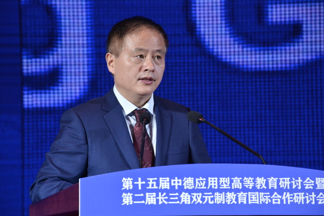 Der Hauptvortrag wurde von Herrn Zhang Gengjia, Mitglied des Bildungsarbeitskomitees vom Provinzparteikomitee, stellvertretender Minister des Bildungsministeriums der Provinz Anhui geleitet. Herr Chu Changlian, Mitglied des Arbeitsausschusses für Bildung der Provinz Anhui und stellvertretender Direktor des Bildungsministeriums, hielt einen Vortrag mit dem Titel ?Vertiefung der Integration der vier Branchen zur innovativen Entwicklung von Anhui“. Er sagte, wir sollten neue Chancen nutzen, um die Integration von Disziplinen und Fachgebieten mit Innovation und Unternehmertum, Industrie und Unternehmen sowie Besch?ftigung der Akademiker weiter voranzutreiben. Er rief alle dazu auf, die qualitativ hochwertige Entwicklung der deutsch-chinesischen anwendungsorientierten Hochschulbildung zu f?rdern und mit Weisheit und Kraft zur Entwicklung der Hochschulbildung in beiden L?ndern beizutragen.