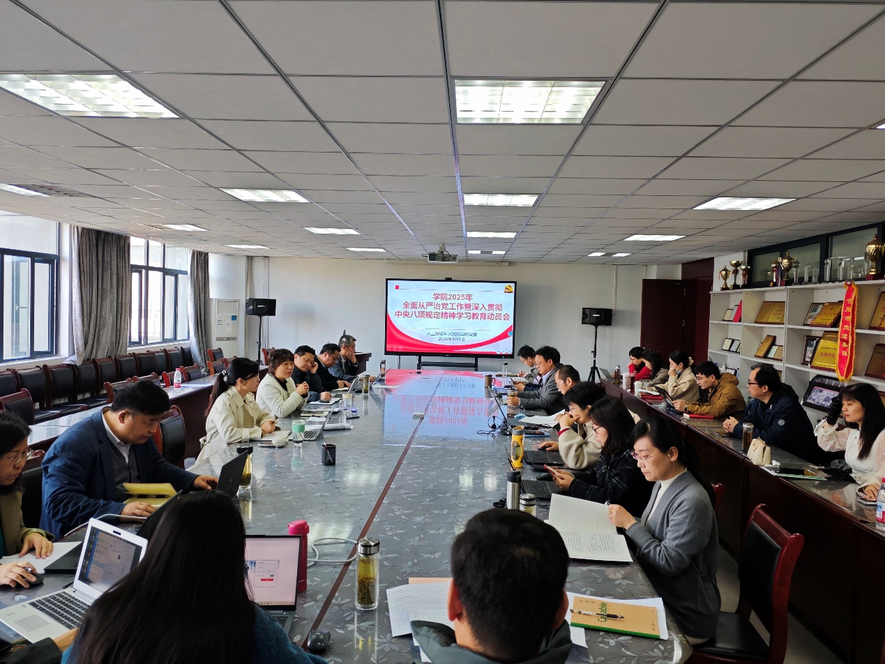 會議深入學習了習近平總書記關于加強黨的作風建設論述和關于深入貫徹中央八項規定精神學習教育的重要講話和重要指示精神;傳達學習了習近平總書記在二十屆中央紀委四次全會上的重要講話精神、省教育系統全面從嚴治黨工作視頻會議精神以及學校全面從嚴治黨工作等會議精神。接著一是對學院2025年全面從嚴治黨的重點工作安排進行布置,二是對學院深入貫徹中央八項規定精神學習教育進行動員和部署,并對學習教育方案進行了解讀。