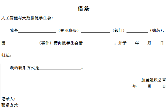 1、合肥學院人工智能與大數據學生會辦公室相關物品外借,在非緊急情況下,需要對方提供借條,借條內容模板如下: