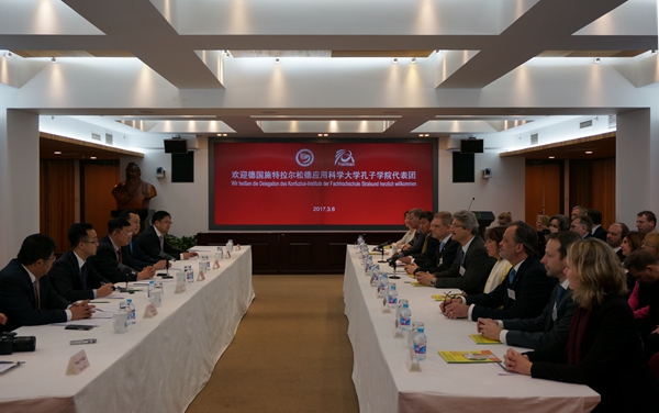 馬箭飛首先對代表團的到訪表示歡迎,對施特拉爾松德市市政府為孔子學院建設所給予的支持表示感謝,對合肥學院在該孔子學院建設過程中的工作表示肯定。馬箭飛表示,施特拉爾松德孔子學院是一所“特別的”孔子學院,在李克強總理與默克爾總理共同見證下簽署協議,并由默克爾總理予以揭牌,承載了兩國政府共同的殷切期望,也是兩國人民偉大友誼的見證;希望該孔院在施特拉爾松德市市政府及合肥學院的共同支持下,打造成為兩國文化、教育及經貿的良好合作平臺,為此孔子學院總部將給予特別支持。巴德洛夫市長感謝孔子學院總部的邀請,并表示,施特拉爾松德市是一座美麗的、開放的世界文化遺產城市,充滿了濃厚的德國傳統文化,并附有獨特的地區特色。施特拉爾松德政府將繼續大力支持該孔院的建設,并借助這一良好平臺,積極推動對華經貿、文化等領域合作。