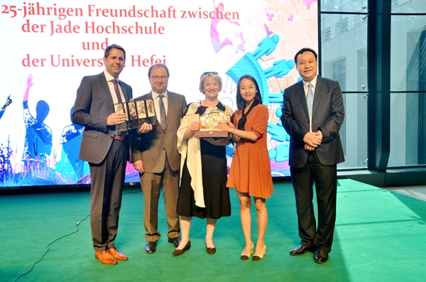 合肥學院與雅德大學結好二十五周年慶典活動在我校圖書館大廳舉行。在觀看了視頻紀念短片后,蔡敬民與德國雅德大學代表科斯特教授分別致辭。雙方回顧了兩校合作歷程后均表示將繼續在現有合作基礎上進一步深化友誼。賴斯部長發表講話,他提到,合肥學院與雅德大學合作基礎雄厚、交往密切,也推動了中德年輕人的交往互動,對雙方來說都是一種智慧投資。慶典活動中,兩校合作培養的338名學生中有部分代表也來到了現場發表感言,并向兩所母校分別贈送了紀念品。合肥學院學生合唱團為到場嘉賓進行了表演,現場氣氛和諧活潑。慶典結束后,賴斯部長及代表團一行在校園里共同種植下象征中德友誼的常青樹。