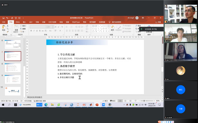 7月4日晚上七點半,“萌芽班”數(shù)學(xué)建模經(jīng)驗交流會之“師兄師姐說建模”在騰訊會議上如期舉行。參加本次會議的有李子龍、彭莉兩位嘉賓以及萌芽班全體同學(xué)。