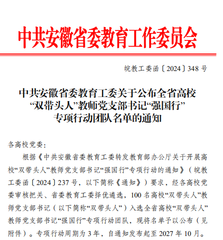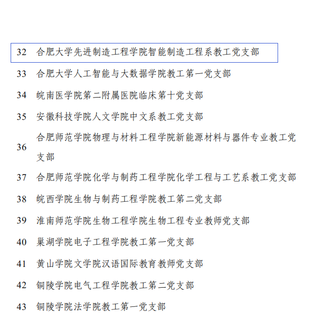 近日,中共安徽省委教育工委公布的全省高校“雙帶頭人”教師黨支部書記“強國行”專項行動團隊名單中,合肥大學(xué)先進制造工程學(xué)院智能制造工程系教工黨支部獲批此項榮譽。