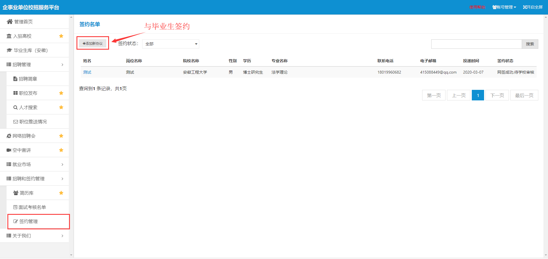 第一步、院系老師和管理員打開網絡簽約管理頁面