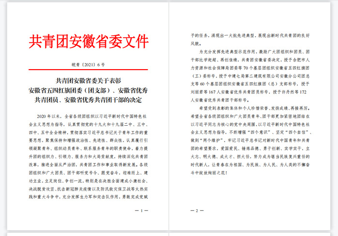 近日,共青團安徽省委員會公布2020年度安徽省“兩紅兩優”評選表彰結果,我校先進制造工程學院2018級自動化專業王宇同學榮獲“安徽省優秀共青團員”稱號。