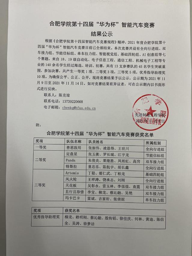合肥學院第十四屆“華為杯”智能汽車競賽結果公示
