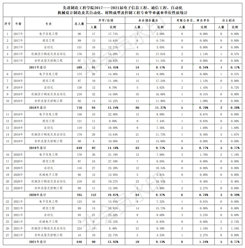 2017—2021屆各專業畢業國企、央企、公務員、事業單位就業統計