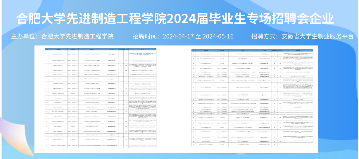 為推動2024屆生實現高質量就業,把握企業春招的機遇,2024年4月17 日至 5月16日,先進制造工程學院依托安徽省大學生就業服務平臺舉辦2024屆畢業生專場招聘會,通過云招聘的形式,為用人單位和畢業生搭建線上雙選平臺,實現畢業生充分就業、精準就業。