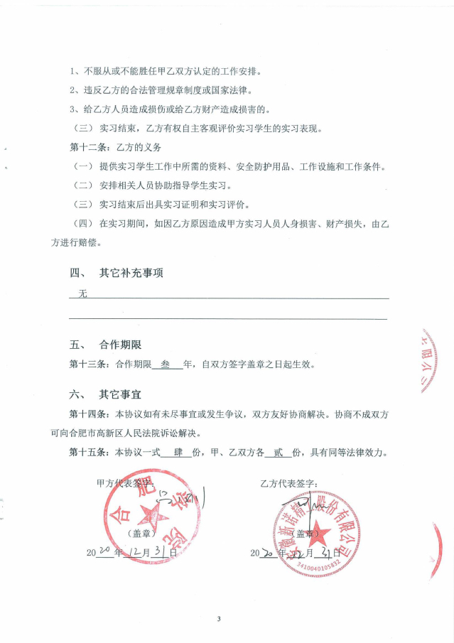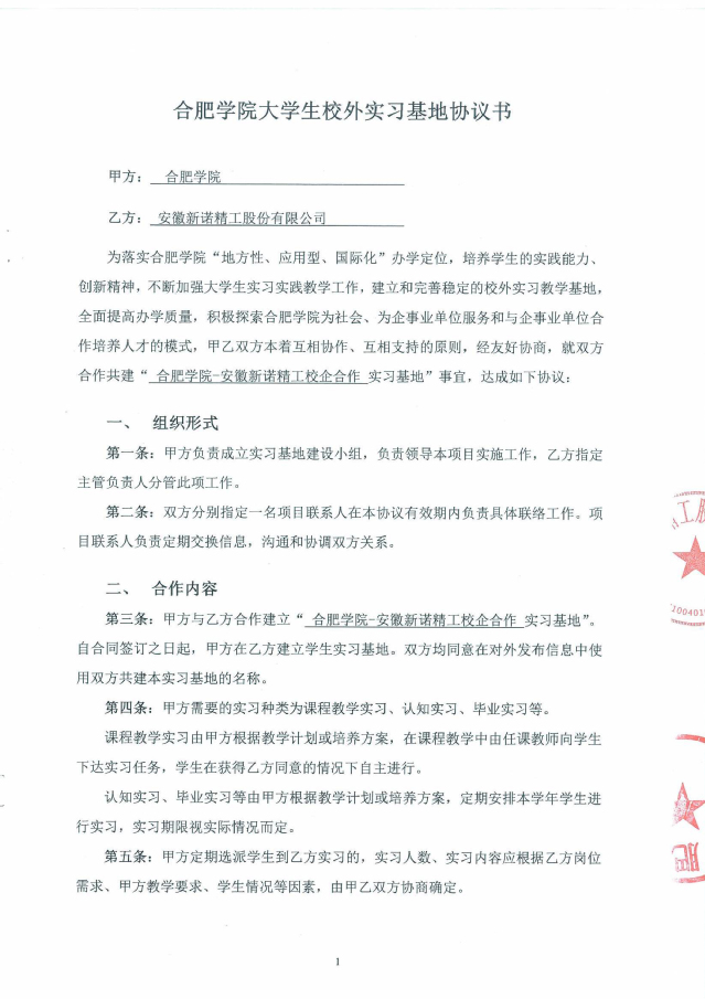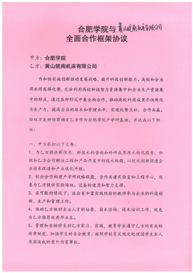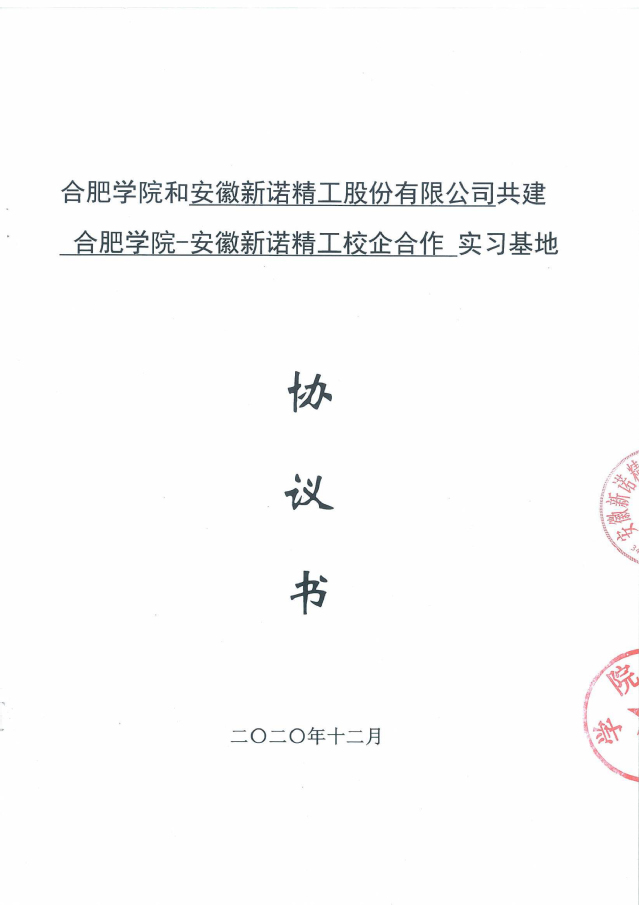 合肥學院與安徽新諾精工股份有限公司原黃山皖南機床有限公司經過友好協商,于2017年9月簽訂了全面合作框架協議,正式開啟了合肥學院-安徽新諾精工校企合作實踐教育基地的建設。2020年2月,雙方又再次簽署了共建實習基地的協議書。合作協議的簽訂,不但明確了校企雙方在合作基地建設中的權利和義務,為雙方順利開展各項實踐教學工作,高質量地培養學生綜合實踐能力和創新能力奠定了基礎;同時也為合作基地的健康發展,以及校企雙方開展全面合作起到了積極的促進作用。