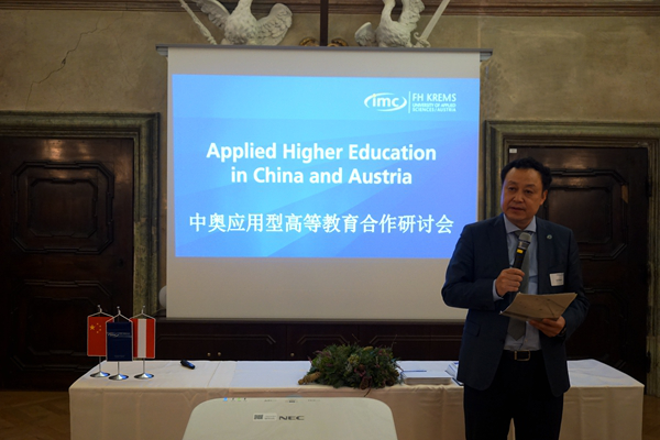 In the following report session, Dr. Cai Jingmin, Chair of HFU Council, elaborates the development, status quo and trend of China’s applied colleges and universities on behalf of Chinese delegation, who hopes to take advantage of the seminar as a sustainable platform for the applied education in the international scale. Professor Eva Werner, president of IMC University of Applied Sciences Krems introduces the characteristics and quality assurance of applied higher education in Austria. Representatives of the Austrian academic exchange center(OeAD) introduce the international exchange projects of higher education and scientific research in Austria and look forward to the participation of applied universities of both countries.