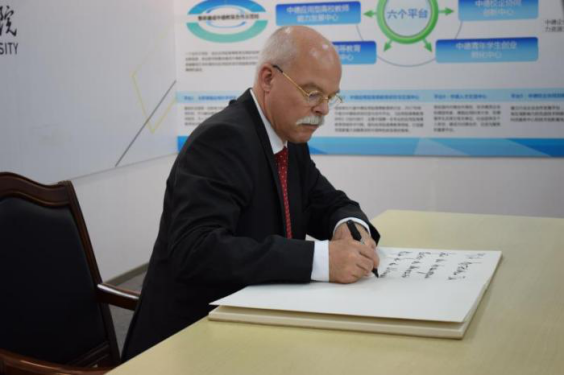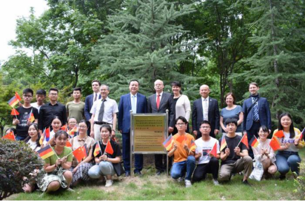 Ambassador Goetze expresses his thanks to HFU for its contribution to Sino-German cultural exchange and educational as well as technological cooperation. Afterwards, Dr. Goetze, Chair Cai and President Wang jointly plant a tree as a symbol of friendship on HFU campus.