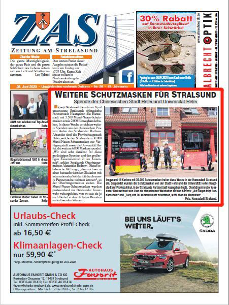 When the materials were delivered to Stralsund, on June 28th a news report entitled “Weitere Schutzmasken Für Stralsund--Spende der Chinesischen Stadt Hefei und Universit?t Hefei” hit the headlines of the local newspaper “Zeitung am Strelasund”, expressing the gratitude from its local residents for HFU’s donation.