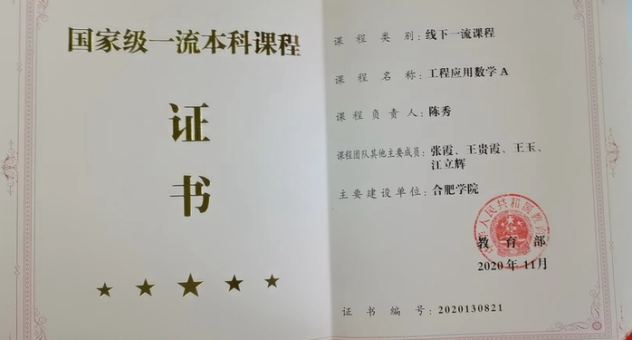 Launched in 2021 by the Online Education Research Center of Chinas Ministry of Education, the “Project Gold” is a nationwide plan to develop more excellent courses and lectures. Upon strict evaluation, Applied Engineering Mathematics A, together with the other 96 courses, was selected from over ten thousand state-level or provincial-level excellent undergraduate courses, into the first batch of the project, which is a great fruit of the HFU math teaching team for their 15-year reform.