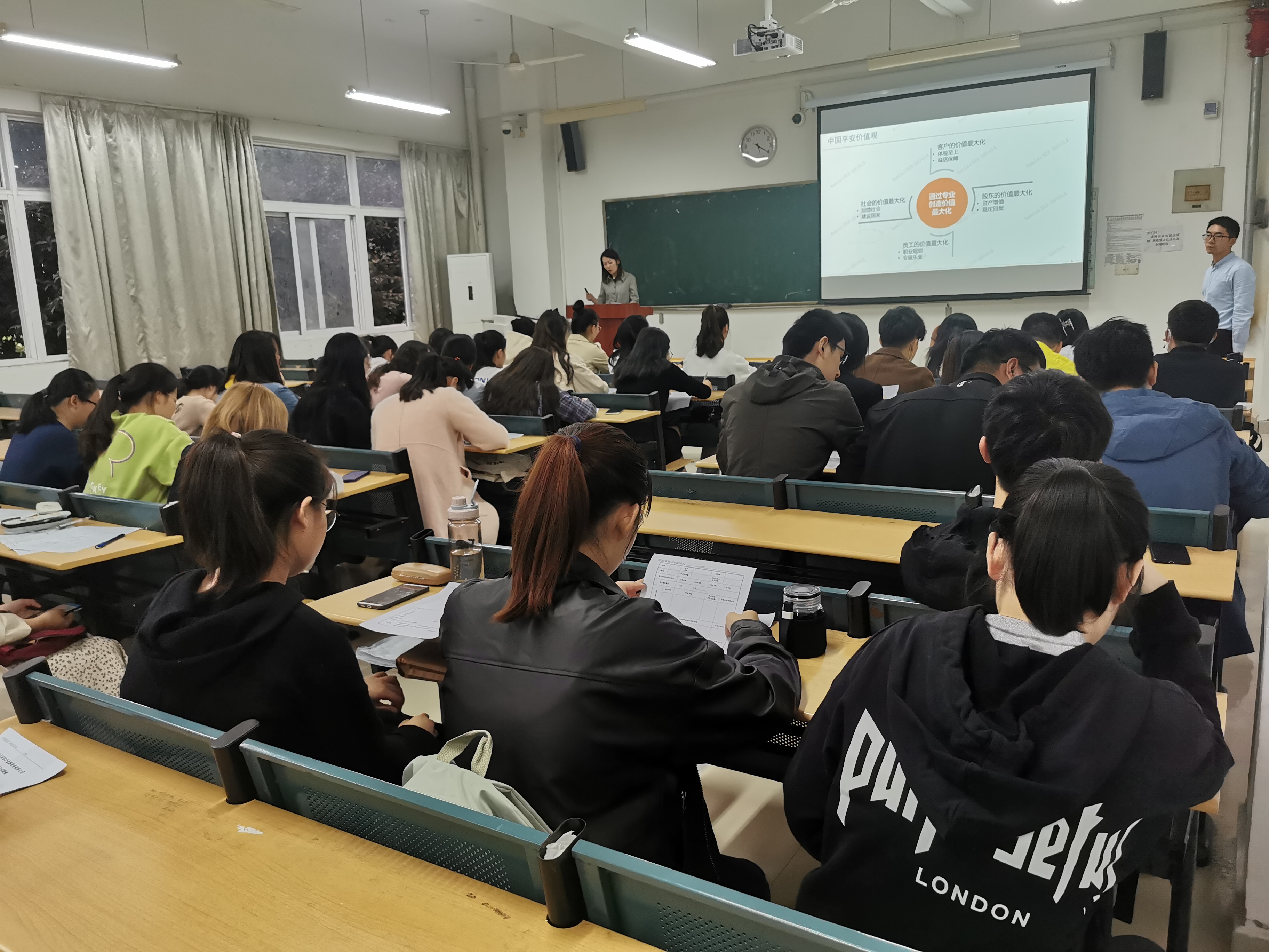 2020年10月15日,平安金服2020-2021年校園招聘會召開,平安金服合肥分公司高級講師方芳,平安財務共享中心區經理韓磊主持本次招聘會,他們以平安集團的架構、企業文化、榮譽業績為引,過渡到平安金服歷史,組織架構,業務范圍以及行業榮譽,讓同學從整體與細節兩方面了解平安金服。在最后的互動環節,兩位主講人耐心回答著前來參加招聘會同學的問題。