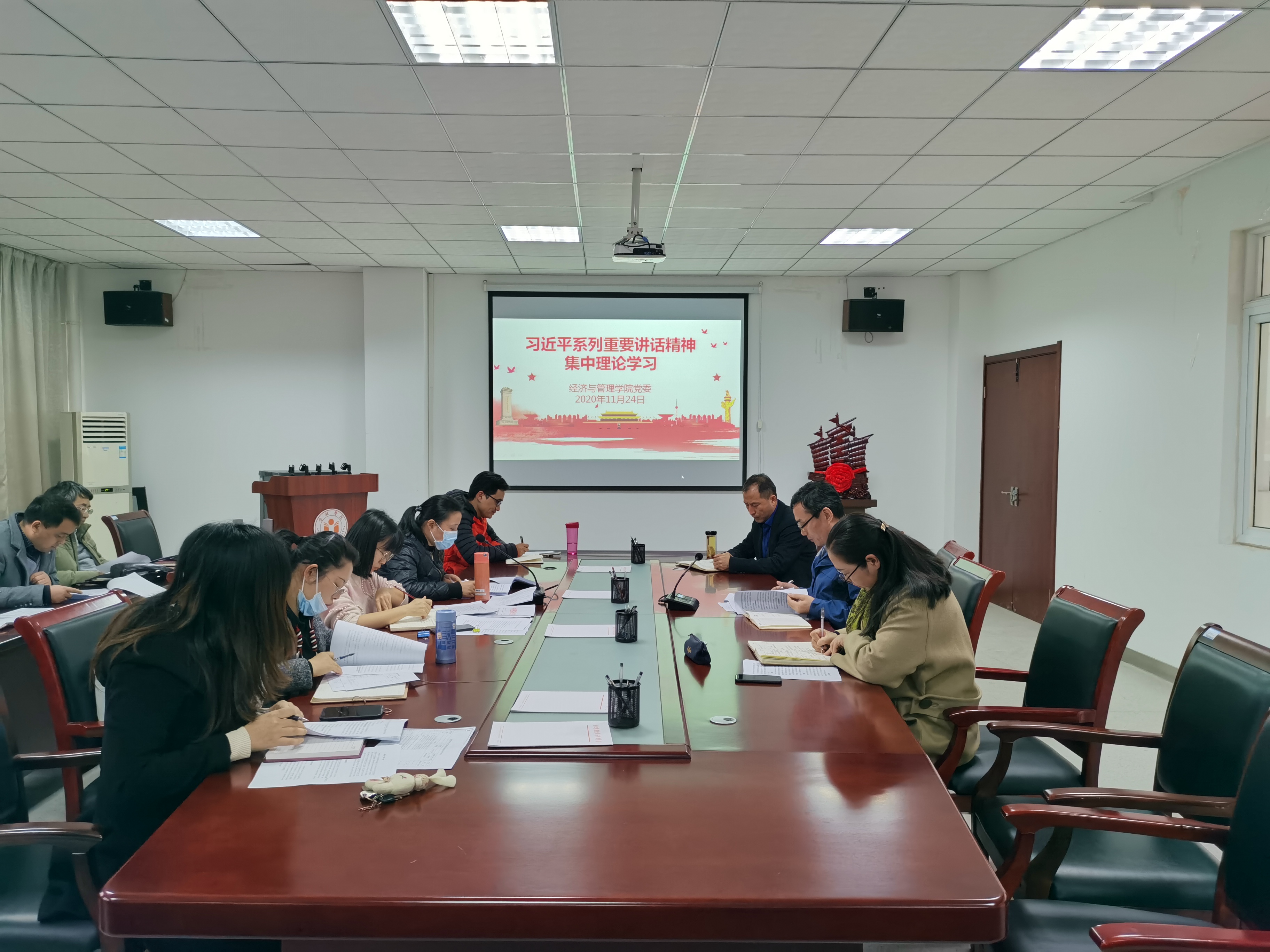 2020年11月24日下午,經濟與管理學院黨委召開黨委擴大會議,集中學習習近平總書記系列重要講話精神,會議由經濟與管理學院黨委書記楊學春主持,院長陳江華、副書記宋玉軍、副院長吳悅以及科級干部和各支部書記認真參加了學習。