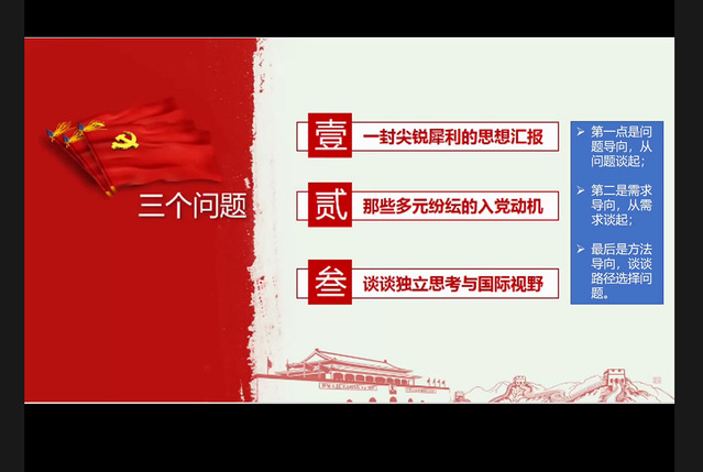 朱濤老師以“端正入黨動機 塑造時代新人”為主題,帶領我院入黨積極分子學習“尖銳犀利的思想匯報”“多元紛紜的入黨動機”“獨立思考與國際視野”三個模塊,分別從問題導向、需求導向、方法導向三個緯度展現了中國共產黨的百年風貌,深刻地闡述了中國共產黨為什么“能”,馬克思主義為什么“行”,中國特色社會主義為什么“好”。朱老師呼吁同學們以讀書行路,培養獨立思考的能力,充分開拓國際視野,端正入黨動機,自覺遵守黨的紀律,積極向黨組織靠攏。