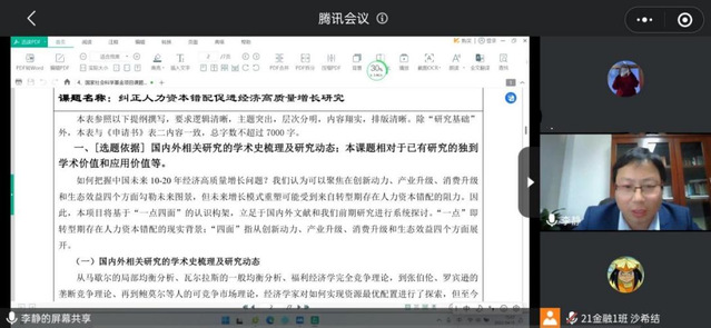 李靜教授圍繞兩個主題展開報告。首先,結合他本人立項的國家社會科學基金項目《糾正人力資本錯配促進經濟高質量增長研究詳細介紹了國家項目申報書的選題與寫作強調選題的學術價值和應用價值申報書寫作的規范性與技巧性,并對申報書各部分進行了詳細講解。講座的第二部分,李靜教授結合他的論文《人才住房政策、房價扭曲與人才區域分布》,從審稿人的角度詳細分享了高質量論文的謀篇布局及寫作經驗與方法,給出的建議中肯務實,具有很高的學習價值與意義。會上,教授還與參會教師進行了熱烈討論和互動交流。
