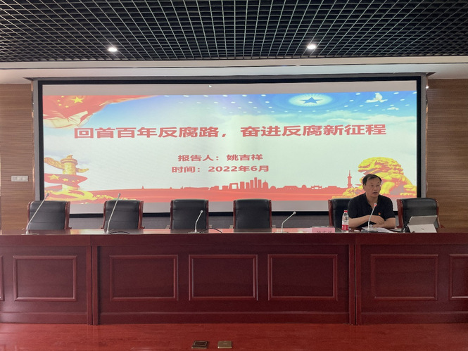 姚吉祥在報告開始時強調,我們每一個黨員都要繼續貫徹落實習近平總書記“學史明理,學史增信,學史崇德,學史力行”的16字要求, 持續深化“四史”學習,尤其是黨史學習,把它作為一門必修課,常學常新。中國共產黨走過的100年的輝煌歷程,也中國共產黨黨風廉政建設和反腐敗斗爭走過的100年的艱辛歷程,一部黨史也是一部反腐敗斗爭史。姚吉祥分別從新民主主義革命時期、社會主義革命和建設時期、改革開放和社會主義現代化建設時期以及黨的十八大開啟中國特色社會主義新時代,詳細闡述了我們黨百年以來反腐倡廉的心路歷程。讓黨員干部深刻體會到全面從嚴治黨和反腐斗爭對中國共產黨百年發展的歷史意義,對第二個百年目標實現的深遠意義,更加堅定信念,奮進反腐新征程。深刻領會在以習近平同志為核心的黨中央堅強領導下,堅持一體推進“三不腐”,全面打贏反腐敗斗爭攻堅戰、持久戰的戰略意義。姚吉祥還就十八大以來十年反腐之路和顯著成效,和大家一起見證了黨中央“無禁區、全覆蓋、零容忍”“打虎”“拍蠅”“獵狐”的反腐決心和堅強意志。通過案例分析警示黨員干部以案為戒,牢記初心使命,守住紀律紅線、廉潔底線。