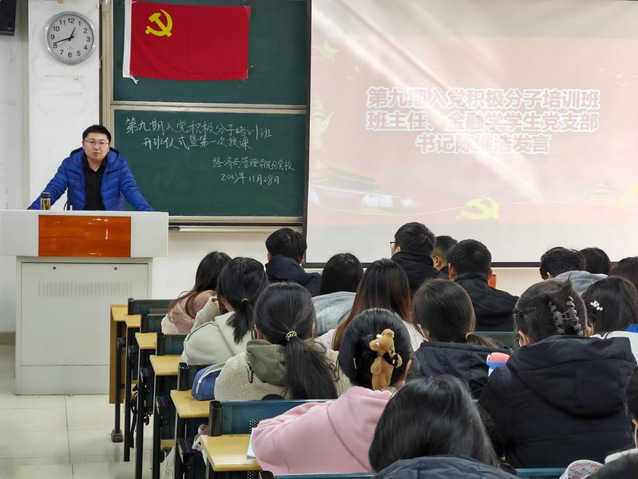 緊接著,第九期入黨積極分子培訓(xùn)班班主任、金融學(xué)學(xué)生黨支部書記陳維浩發(fā)言。陳維浩就舉辦入黨積極分子培訓(xùn)班的重要意義以及如何端正入黨動機(jī)進(jìn)行了分享,向?qū)W員們提出要求,作出展望,期望所有學(xué)員能夠積極向黨組織靠攏,增強(qiáng)組織觀念,并在學(xué)習(xí)、生活各方面發(fā)揮先鋒模范作用。