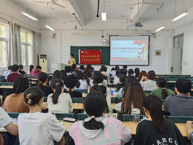 2024年5月16日中午,經濟與管理學院工商管理學生黨支部在6棟101教室開展第十期入黨積極分子交流研討會,與支部黨員共同學習交流研討《中國共產黨紀律處分條例》。 首先,支部負責人向大家宣讀此次《條例》修訂的新增內容和介紹《條例》的突出特點,并與學生黨支部內的紀律規定相聯系,強調了黨組織紀律教育的重要性。接著,學員們根據《條例》主要內容,結合全面從嚴治黨發表自己的理解與看法,提出“要將紀律意識刻進骨子里,把鐵的紀律轉化為日常習慣和自覺遵循”、“要用黨員標準嚴格要求自己,嚴守黨的紀律,砥礪擔當作為”。最后,全體學員就“如何做到學紀知紀明紀守紀”共同展開討論,上至遵照黨規黨紀,下至結合學生日常行為守則,學員們紛紛提出自己的建議,總結概括為“系統全面學習、行為自覺、加強自身約束、起到模范帶頭作用”四個方面。