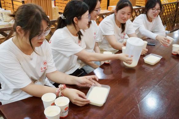 在八公山中國豆腐村,團(tuán)隊(duì)成員通過采訪當(dāng)?shù)卮迕癜l(fā)現(xiàn),村里雖有古色古香的文旅景觀,但實(shí)際從事傳統(tǒng)豆腐制作的農(nóng)戶數(shù)量正在不斷下降,產(chǎn)業(yè)鏈有待完善,相關(guān)補(bǔ)貼和技能培訓(xùn)不足。在豆腐主題文化園的體驗(yàn)區(qū),團(tuán)隊(duì)成員們?cè)L談了工作人員,嘗試了親手磨豆?jié){、點(diǎn)豆腐,在這一過程中成員們切實(shí)感受到了文旅和研學(xué)資源對(duì)實(shí)現(xiàn)產(chǎn)業(yè)融合發(fā)展的重要意義,也引導(dǎo)成員們更加深入地思考如何找到更多的產(chǎn)業(yè)融合著力點(diǎn),多方位促進(jìn)鄉(xiāng)村產(chǎn)業(yè)振興。