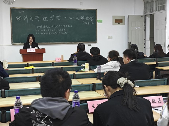 為豐富校園文化生活,提升學生思辨能力,2024年10月30日晚,經濟與管理學院“一二?九”辯論賽決賽在一期六棟307教室舉行。