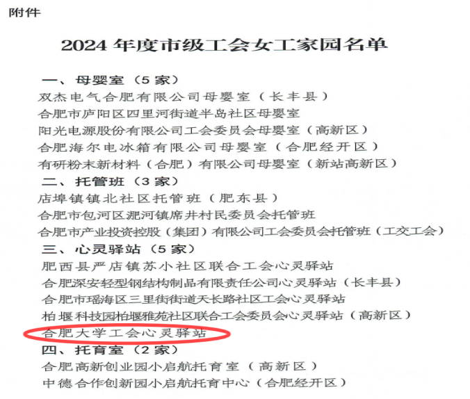 近日,我院女工家園——“心靈驛站”為主體的合肥大學(xué)工會心靈驛站被合肥市工會正式命名為“合肥市示范女工家園”。同時,還獲得了項目資助金,以表彰和支持我院在關(guān)愛女工心理健康、構(gòu)建和諧工作環(huán)境方面的杰出貢獻。