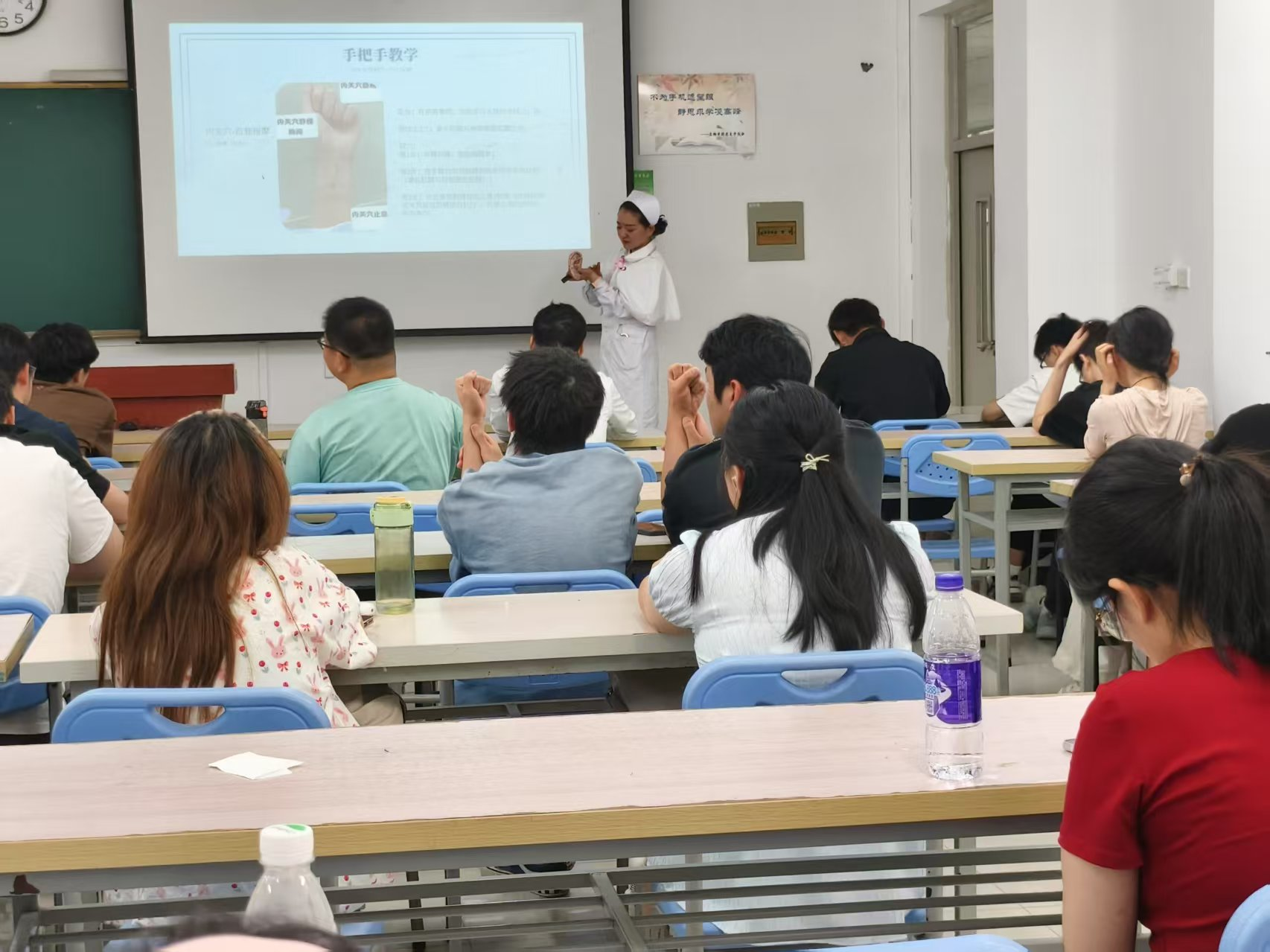 在講座過程中,武老師特別強調了“手把手教學”的重要性。她通過圖解和文字說明,詳細介紹了足三里、合谷、太沖等穴位的自我按摩方法,以及拍八虛的拍打技巧。這些方法不僅簡單易學,而且效果顯著,能夠幫助學生在日常生活中自我調節情緒,緩解壓力。