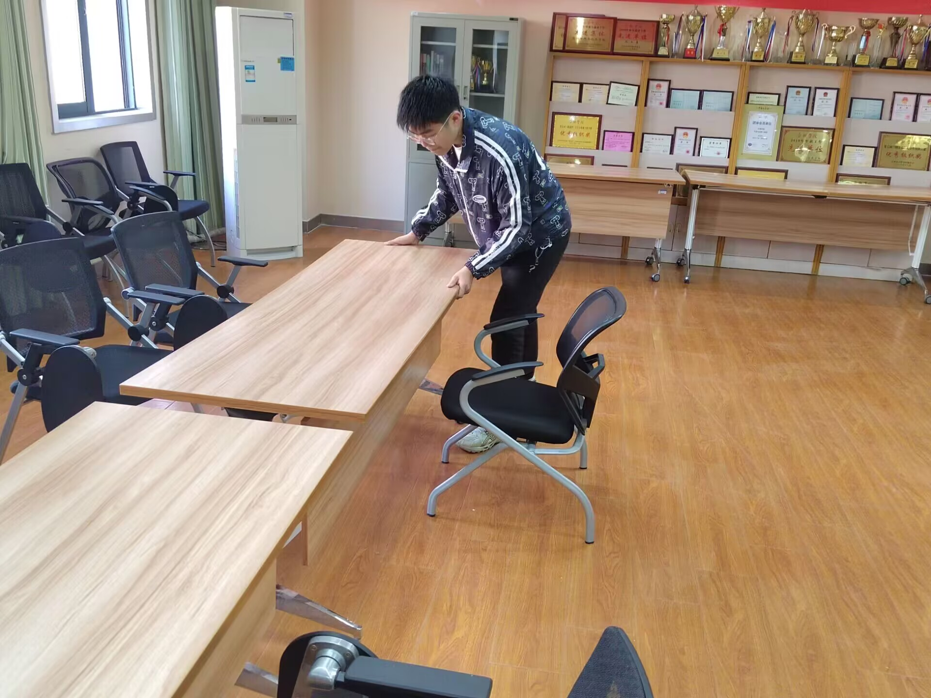 活動準時開始,志愿者們干勁十足,各項打掃都在有條不紊的進行著。打掃內容包括用掃把清掃地面的灰塵紙屑并用拖把拖干凈,將抹布清洗干凈后擦洗桌子、座椅,窗戶玻璃上的污垢。志愿者們互幫互助,認認真真的將會議室里里外外都打掃了一遍,在活動進行過程中,針對衛生死角,于是志愿者們對其進行了集中的處理,取得了很好的效果。活動結束后,會議室里里外外煥然一新。