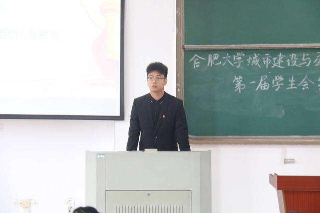 會議第五項,主席團代表萬佑良發言,他表示未來一年他將帶領學生會努力做到平衡學習與工作,踐行學生會為同學服務的初心使命,既要當好“學生”,注重學習專業知識,又要完成好團學工作任務,服務同學。