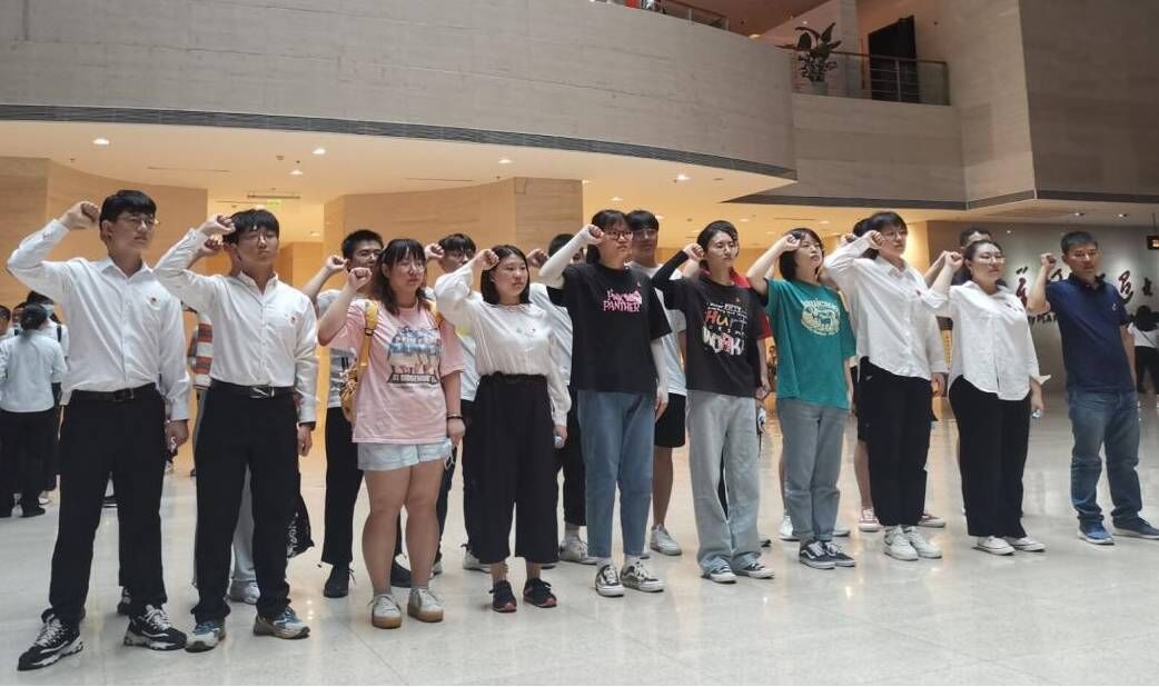 在渡江戰役紀念館中,全體黨員仔細觀看每一件歷史見證物,追尋烈士足跡,詳細了解了渡江戰役時期的感人故事,通過觀看紀錄片《八百將士憶渡江》、反映驚心動魄的渡江場景的半景畫館和超寫真的4D電影等,讓師生黨員體驗到最真實的渡江戰役的全過程。面對莊嚴的黨旗,重溫入黨誓詞,進一步強化黨員意識、提升黨性修養。