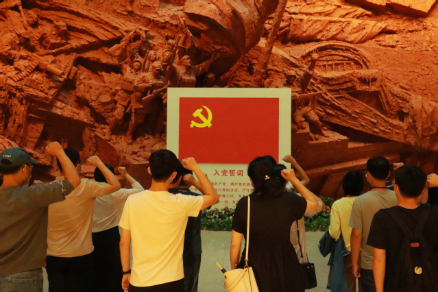 在館內,全體師生黨員進行了重溫入黨誓詞活動。面向黨旗,整齊列隊,舉起右拳,高聲宣讀入黨誓詞。