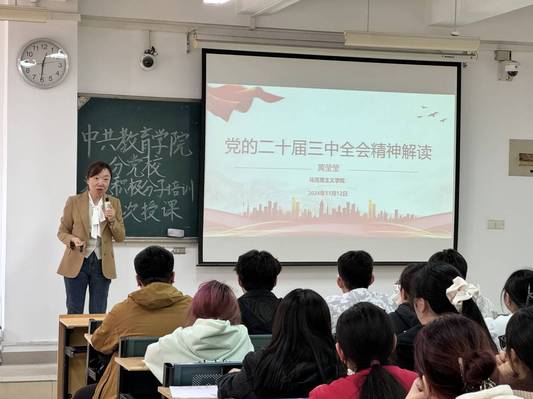為了幫助我院學生入黨積極分子深入理解黨的最新政策方針,堅定其理想信念,為早日成為合格的共產黨員打下堅實基礎,教育學院分黨校于2024年11月12日中午12:30,在三棟301教室,開展了一場別開生面的入黨積極分子培訓課。此次培訓特別增設了黨的二十屆三中全會精神解讀專題,并邀請馬克思主義學院黃瑩瑩老師進行授課。 培訓伊始,黃瑩瑩老師以飽滿的熱情和專業的知識,向入黨積極分子們詳細闡述了黨的二十屆三中全會的重大意義、核心內容和深遠影響。她強調,黨的二十屆三中全會是在我國全面建設社會主義現代化國家的關鍵時期召開的一次十分重要的會議,會議通過的《中共中央關于進一步全面深化改革、推進中國式現代化的決定》是指導新征程上進一步全面深化改革的綱領性文件。