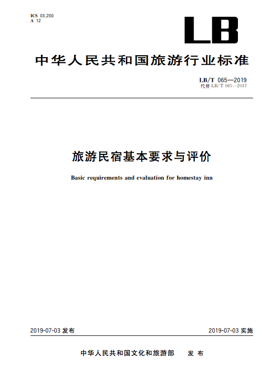 2019年7月19日,文化和旅游部官網(wǎng)發(fā)布公告宣布新版《旅游民宿基本要求與評(píng)價(jià)》(LB/T 065—2019)已通過批準(zhǔn),并自發(fā)布之日起實(shí)施。據(jù)了解,新公布的《旅游民宿基本要求與評(píng)價(jià)》將替代2017年由原國(guó)家旅游局發(fā)布的《旅游民宿基本要求與評(píng)價(jià)》。