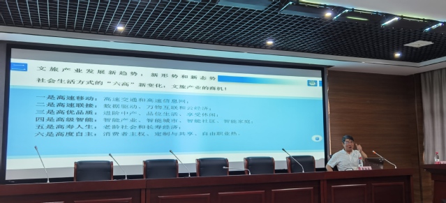 在報告中,黃教授結合國家政策和豐富的旅游產業研究經驗,對我國文旅產業發展的新趨勢,社會生活方式的新變化進行了分析與研究,科學解讀了文旅產業新趨勢、新定位與新業態、新產品。通過對文旅產業新商機的挖掘,從個人研究角度為在座的師生指明了旅游產業未來發展的方向。宋玉軍院長對報告進行了點評,他認為本場報告視野宏達廣闊,觀察細致入微,內容博大精深,體系完整全面,是一場高質量的學術報告,具有很高的學理性和很強時代性的學術盛宴。相信在座的師生受益匪淺,啟發很大。