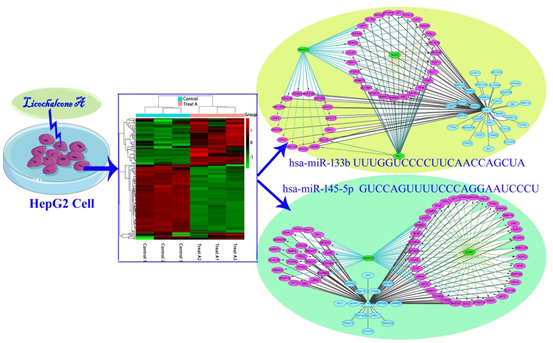 本研究利用團隊前期建立的miRNA組學技術,嘗試在miRNA組學水平上揭示甘草查爾酮A對人肝癌細胞HepG2的抗癌作用機制。甘草查爾酮A處理HepG2細胞后,共鑒定出102個DE-miRNA,其中SP1被認為是調控DE-miRNA的主要轉錄調控因子。對DE-miRNA的靶基因進行預測和富集通路分析,發現FoxO通路是核心富集通路。通過構建miRNA-靶基因調控網絡鑒定出關鍵DE-miRNA(hsa-miR-133b和hsa-miR-145-5p),并進一步構建關鍵DE-miRNA-靶基因-轉錄因子的三級調控網絡,在miRNA水平闡明甘草查爾酮A對人肝癌細胞HepG2的抗癌作用機制。