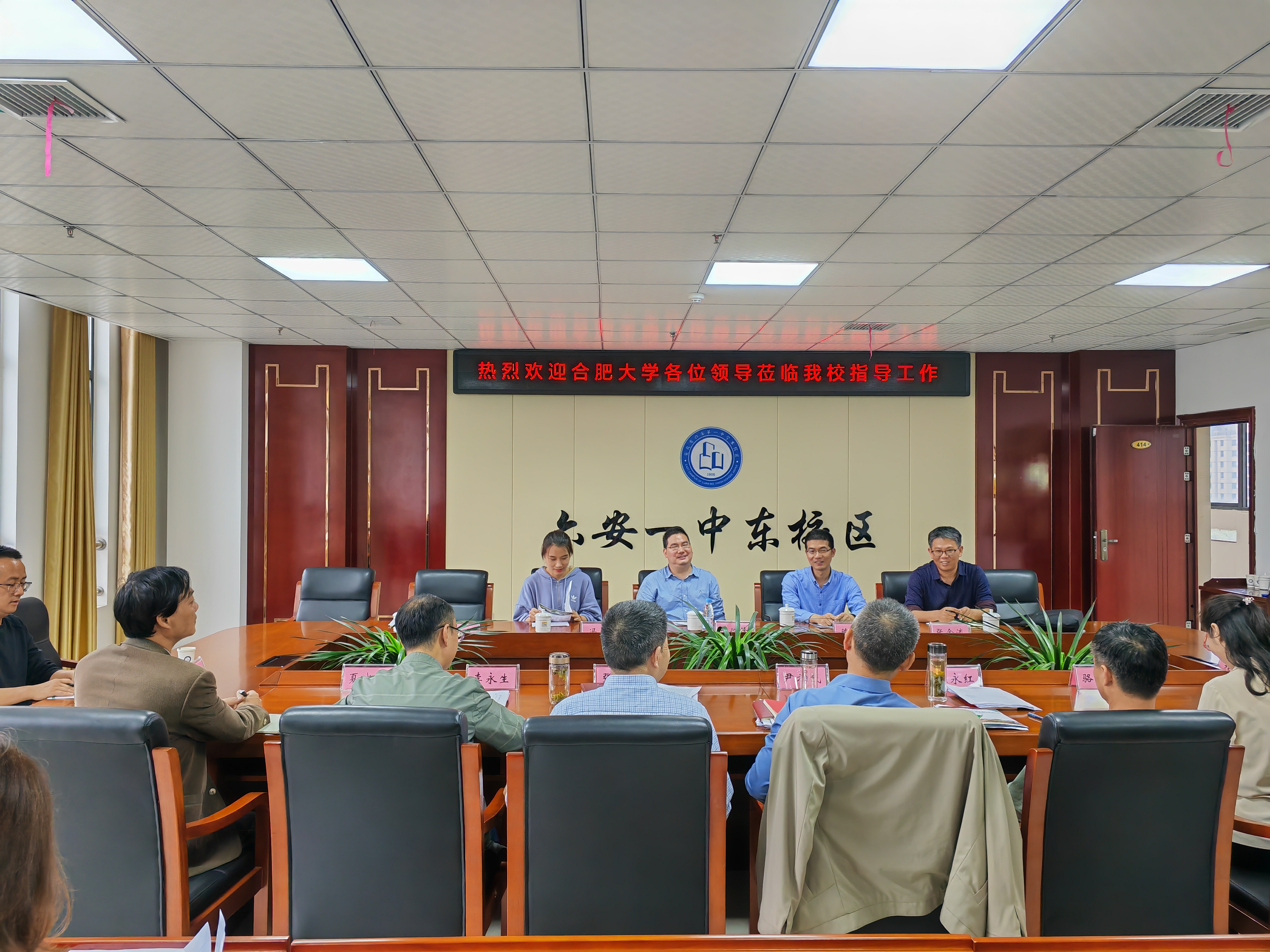 在六安一中東校區,阮班鋒對六安一中東校區近年來為合肥大學輸送了大批優秀學生表示衷心感謝,并邀請東校區的師生到合肥大學進行參觀交流。陳俊介紹了我院辦學特色、就業前景和2024年招生計劃等情況。尹孝成校長隨后簡要介紹了東校區的發展歷史、辦學理念和高考升學率等基本情況,表示將進一步加強與大學教育的良性互動,積極探索中學教育與大學教育銜接貫通的路徑,共同搭建平臺,協同育人。座談會后,雙方舉行了合肥大學和六安一中東校區“優質生源基地”授牌儀式。