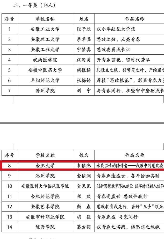 在安徽省高校班級思政委員征文比賽中,生物食品與環境學院22食品科學與工程一班韋依池同學榮獲一等獎。