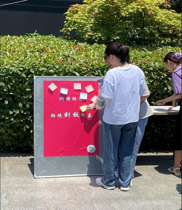 活動期間,同學們了解了標簽對個人心理健康的負面影響。拒絕不合理的標簽,在放置的板子上,將生活中常見“標簽”的便利貼貼上,同學們寫下了各種對自己心理造成壓力的話,然后通過交流和了解,逐步撕掉這些標簽。