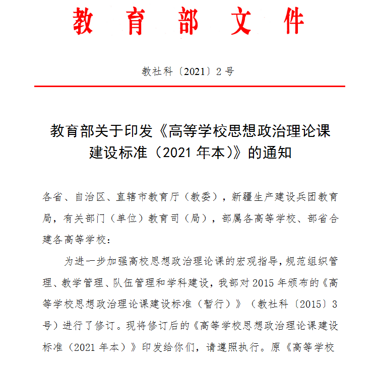 教育部關于印發《高等學校思想政治理論課建設標準(2021年本)》的通知(教社科〔2021〕2號)