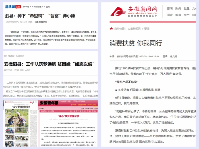 我校獲“省屬單位脫貧攻堅先進集體”、“泗縣脫貧攻堅奉獻獎——突出貢獻獎”等多項榮譽。兩個扶貧項目作為典型經驗被教育部網站推廣。連續四年在省直定點扶貧考核中獲得“好”等次,位居省屬高校前列。人民網、新華網、央廣網、中國扶貧網、安徽日報、安徽青年報等媒體紛紛報道學校扶貧工作開展情況,社會各界給予充分肯定。